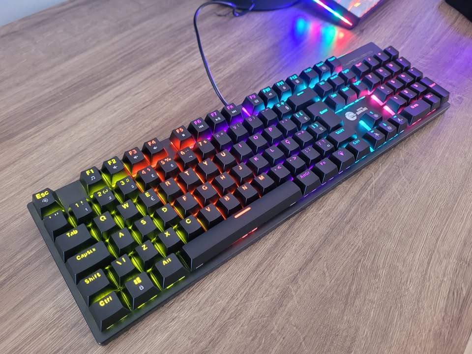 Teclado gamer mecânico switch blue padrão ABNT com teclado numérico e RGB. Excelente acessório para seu setup pc gamer ou notebook gamer.